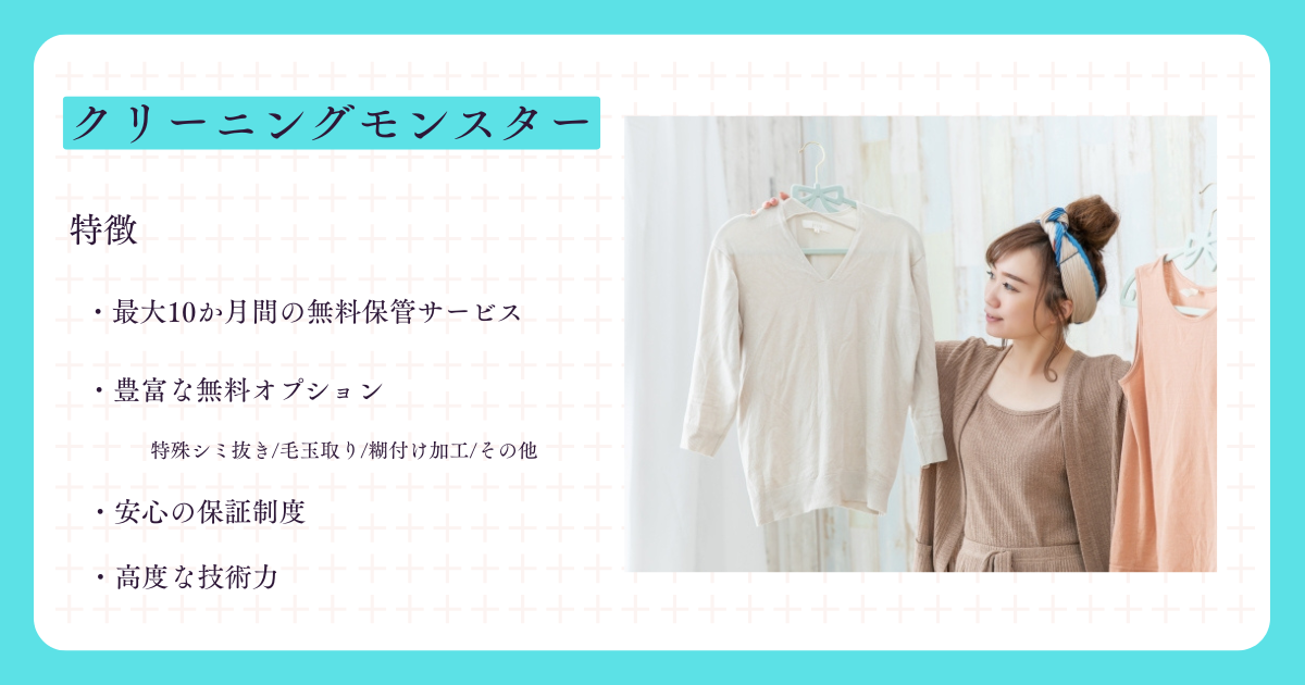 中でも「クリーニングモンスター」は、最大10か月間の無料保管ができる点で注目されています。創業65年の老舗が運営し、豊富な無料オプションと安心の保証体制を備えているため、多くの利用者から支持を集めています。